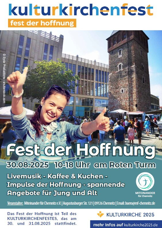 Wir laden euch herzlich zu dem Fest der Hoffnung am 30.8.2025 ein, welches von Miteinander für Chemnitz veranstaltet wird. Wir werden uns als WeltBeweger beteiligen und das Team unterstützen. Kommt gern vorbei und bringt eure Freunde oder Nachbarn mit. Ihr findet uns am Roten Turm im Zentrum von Chemnitz. Dieses Jahr ist das Fest Teil des Kulturkirchenfests.